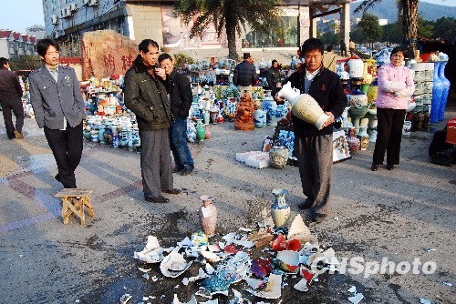 12月28日,一商家当众怒砸瓷器,引来市民围观。来自江西景德镇的精品陶瓷展销会在湖南郴州展出近50天来,由于天气等诸多原因交易一度冷清,全场总销售额不足支付回家运费,一筹莫展的商家们进退两难,屡次出现因低价销售却少有人问津而怒摔瓷器的现象。元旦将至,商家们准备在元旦期间全场瓷器以成本价的50%甩卖,筹足运费即结束展销。
