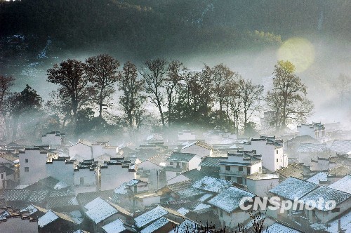 晨雾笼罩的江西省婺源县大鄣山乡石城村,山头屋脊上的零星残雪衬着旭日霞光将小山村点缀得如梦如幻,宛如仙境。