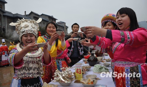 图:四川苗寨摆起百米长宴庆丰收迎新年(4)