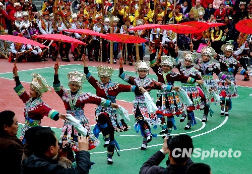 2009年岁末,广西融水苗族自治县少数民族吹芦笙、跳踩堂舞,以古老的民族风俗迎接新年的到来。中新社发 石峰 摄