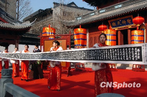 礼仪小姐在展示一幅《新三字经》30米长卷,该长卷为中华文化促进会会长高占祥为庆贺杭州西湖国学馆开馆而作。中新社发 施健学 摄