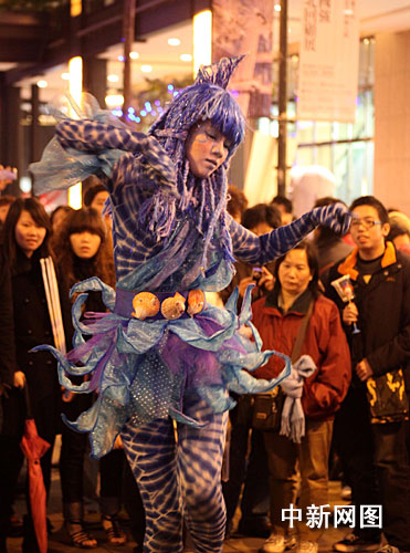 12月31日跨年夜,一些街头艺人在台北市的闹市区秀艺助兴,吸引了大批的民众观看。
