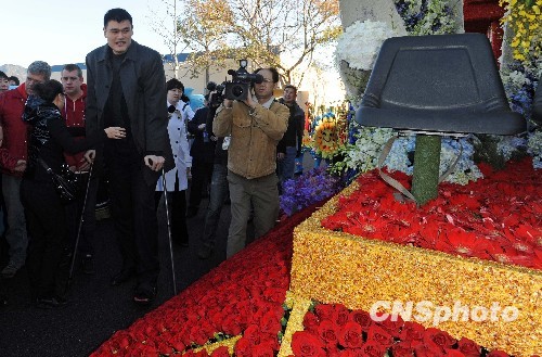 姚明表示,他很想上花车,但脚伤未癒,上花车和坚持全程有困难,明天花车巡游时能否顺利登上花车还不能确定。中新社发 张炜 摄