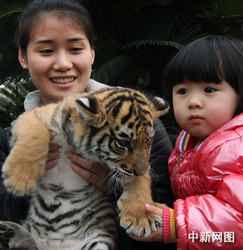 游人亲密接触小老虎。陈仕川 摄