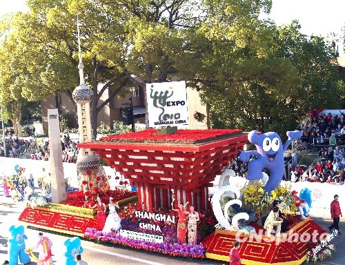 当地时间2010年元旦,世界瞩目的第121届美国帕萨迪纳玫瑰花车大游行在洛杉矶热闹登场。