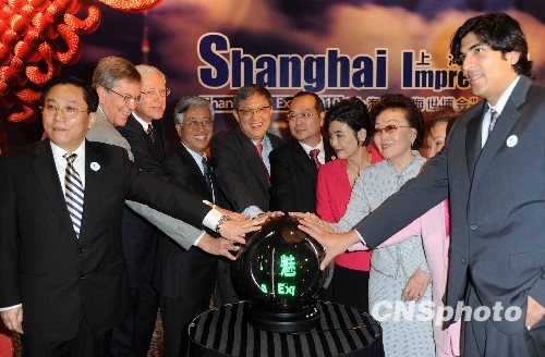 中国驻美大使周文重(左五)、上海市长代表杨振武(左六)、中国驻洛杉矶总领事张云(左四)及美国国会议员赵美心(左七)等为图片展揭幕。中新社发 卢威 摄