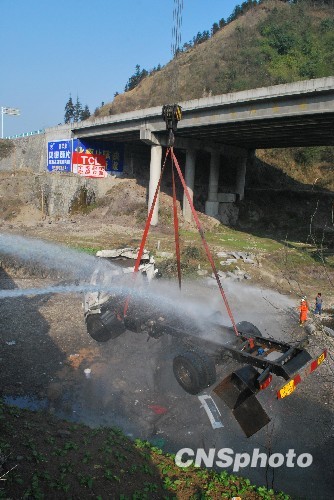 图:贵州三穗320国道上运油车坠桥(3)