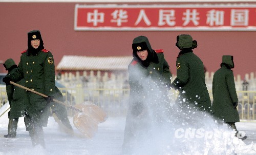 一月四日,在两天大雪过后,北京市民上街铲雪。市政府已经号召市民企业、事业单位,各家自扫门前雪,分片包干,畅通北京交通。