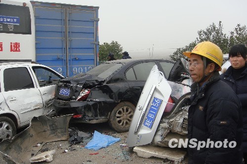 1月3日9时许,湖南省湘潭市潭邵高速1092公里韶山收费站往湘乡方向2公里处,因大雾发生38台车在4个事故点连环追尾相撞。事故发生后,湘潭市60多名消防官兵和8台消防车紧急前往救援,成功救出8名被困人员。事故造成3人当场死亡,13人受伤。并造成这一路段拥堵长达2小时。中新社发 郭国权 摄