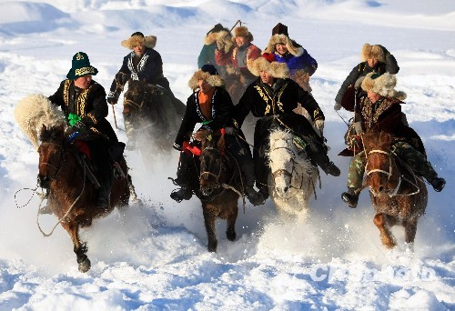 新年伊始,新疆布尔津县喀纳斯景区牧民在雪中表演精彩的叼羊比赛。元旦期间,新疆布尔津县禾木喀纳斯蒙古民族乡举办第三届喀纳斯冰雪风情旅游节,当地蒙古族和哈萨克族牧民,用赛马、叼羊、姑娘追等民间传统体育项目迎接新年的到来。