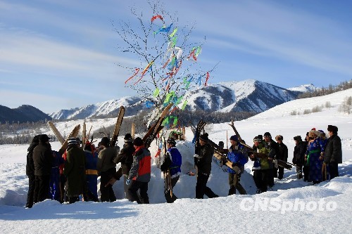 新年伊始,新疆布尔津县禾木喀纳斯蒙古民族乡举办了第二届古老毛滑雪狩猎比赛,50多名当地蒙古族和哈萨克族牧民脚蹬古老毛皮滑雪板,背后拉着“猎物”,穿行在茫茫雪原中相互追逐,为四方游客上演了一场图瓦人古老的狩猎方式。