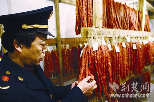 工商执法人员检查香肠肠衣。 魏铼 摄