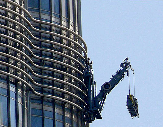 1月5日,工人们搭乘伸缩臂清洁世界第一高楼、位于阿拉伯联合酋长国迪拜的“哈利法塔”(前称“迪拜塔”)外墙玻璃。为确保这座828米的高楼以洁净面貌现身典礼,清洁工们带着水桶和清洗剂,搭乘12台重达13吨的伸缩臂高空作业三个月,终于清洗完迪拜塔表面2万多块玻璃。