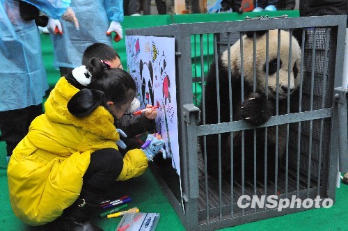 图:小朋友用画笔为世博熊猫送祝福——中新网