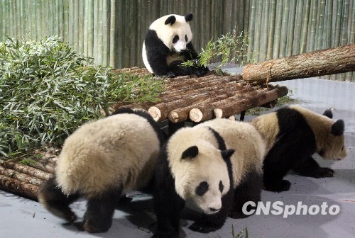 1月5日,由卧龙中国保护大熊猫研究中心精心遴选的10只“世博熊猫”经空运抵达上海,搬入上海动物园的新家。这10只大熊猫将与上海世博会的吉祥物‘海宝’一起,迎接世博会的来临。届时,海内外游客在参观上海世博会的同时还可领略中国大熊猫的风采。中新社发 汤彦俊 摄