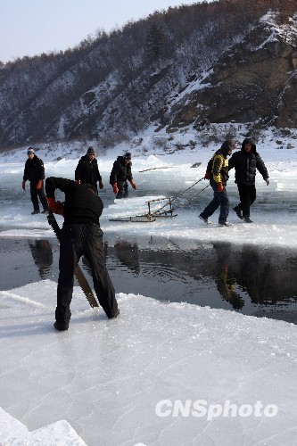 小兴安岭冬泳队泳池五米宽二十米长,每天的冻层达10公分左右,队员们每天都要劳动1-2小时“破坚冰”,所搬运的冰量达3-5吨。 中新社发 于虤虤 摄