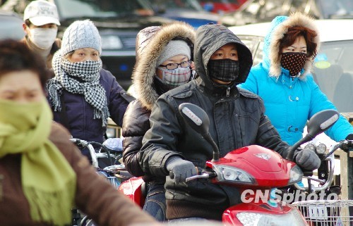 苏州遭遇一股强冷空气来袭,气温骤降,一夜之间降温超过10摄氏度,气温狂降到-3℃。众多苏州市民在纷纷添衣保暖戴上了口罩来抵御寒潮。中新社发 苏民 摄
