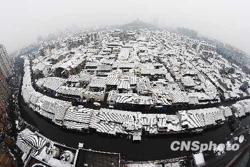 2010年1月6日,一场小雪飘落在古城浙江绍兴市区的上空,古城绍兴被白雪所覆盖。中新社发 李瑞昌 摄
