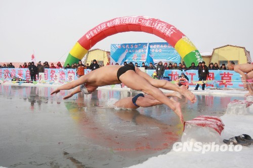 1月5日,在哈尔滨总工会江上运动中心松花江冬泳场,第26届中国哈尔滨国际冰雪节重头戏之一——第10届中国哈尔滨国际冬泳比赛隆重开赛。来自广州、扬州、呼和浩特等16个省、自治区的28个城市的冬泳代表队,以及白俄罗斯、乌克兰、俄罗斯等5个城市,共计350名男女运动员参加比赛。中新社发 姚庭山 摄