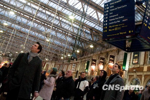 1月6日伦敦滑铁卢车站,持续的大雪造成许多车次延误或取消,大量旅客滞留。从5日夜间起英国大部分地区大雪,南部地区降雪量近40厘米,部分交通中断,气温达三十年最低点。当地气象局预计,伦敦今夜气温将降至零下七摄氏度。