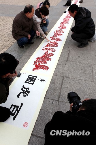 1月7日,河南省许昌市民间艺人吴遂洲在春秋广场展示《百虎图》剪纸长卷。中新社发 牛书培 摄