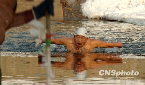 1月7日,北京数百名冬泳滑冰爱好者纷纷来到玉渊潭公园东湖锻炼,体验雪中运动的快乐。中新社发 邹宪 摄