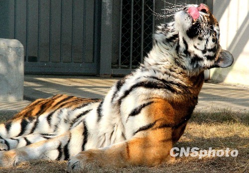 2010年1月6日,江苏苏州尽管寒气袭人,苏州动物园猛兽观赏区一只3岁东北虎时而漫步游逛,时而坐卧躺歇,活泼可爱的虎姿与神态各异的“表情”为市民游客增添了不少情趣。中新社发 王建中 摄