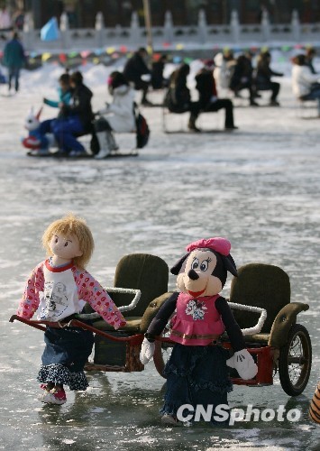 1月7日,北京什刹海冰场的几辆“机器人黄包车”停在冰面上,等待小朋友坐上来体验溜冰的乐趣。这种“机器人黄包车”可在冰面上自动行驶,“车夫”都由卡通人物来扮演,颇为可爱。中新社发 苏丹 摄