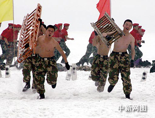 图:长春消防官兵赤身进行耐寒攻坚演练