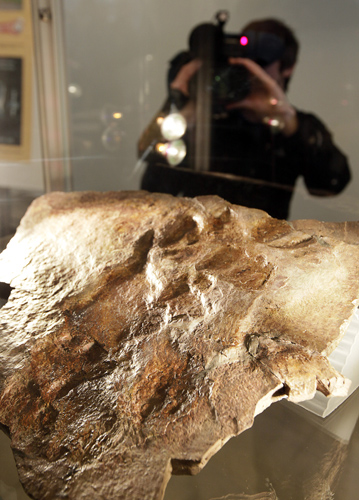 图为1月7日新发现的动物足迹化石在波兰华沙地质博物馆展出。