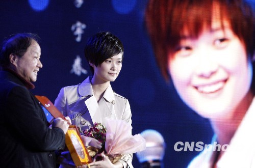 1月8日,“十年·影响中国”颁奖典礼暨《中国新闻周刊》十周年庆典在北京举行,李宇春获“十年影响力·文化领域人物”奖,《建国大业》总策划张和平为她颁奖。中新社发 张宇 摄