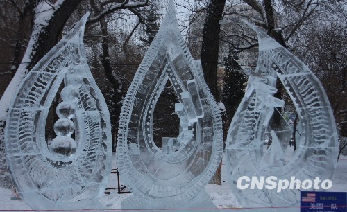 1月8日,第24届中国·哈尔滨国际冰雕赛在哈尔滨兆麟公园落下帷幕。来自俄罗斯、美国、丹麦、日本、泰国等7个国家的19支代表队参加竞技。经过三天精雕细琢,19件冰雕艺术作品栩栩如生呈现,为第26届国际冰雪节带来生机,也为哈尔滨迪士尼冰雪游园会增添一道靓丽风景。经评选,美国一队的《GEO-FLAMES》(几何火焰)获一等奖;中国二队的《FENCING》(亮剑)和俄罗斯符拉迪沃斯托克二队的《CITY》(城市)获二等奖;日本二队的《TOWARD THE LIGHT》(奔向光明)和泰国二队的《PEACE PRAYER BUDDHA》(祈祷和平之佛)获三等奖。中新社发 王忠言 摄