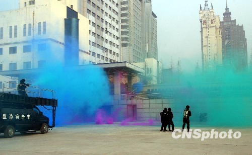 1月8日下午,郑州市公安局特巡警支队在其支队训练场举行“铁拳行动”反抢劫实战演习。特巡警接警快速出击堵截合围并施放防爆催泪弹。 中新社发 刘书亭 摄