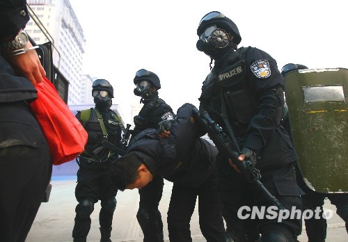 1月8日下午,郑州市公安局特巡警支队在其支队训练场举行“铁拳行动”反抢劫实战演习,特巡警接警快速出击堵截合围并将“歹徒”一一擒获。中新社发 刘书亭 摄