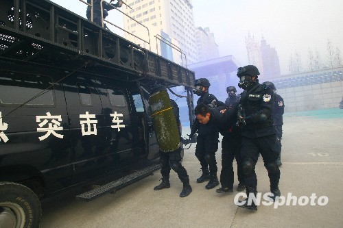 1月8日下午,郑州市公安局特巡警支队在其支队训练场举行“铁拳行动”反抢劫实战演习,特巡警接警快速出击堵截合围并将“歹徒”一一擒获。中新社发 刘书亭 摄