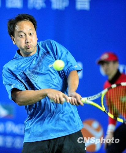 在香港举行的2010年香港网球精英赛,八日进入第三个比赛天。代表美洲队出战的华裔名将张德培,以4-6/6-2/6-10的比分不敌前亚洲一哥斯里查潘。中新社发 谭达明 摄