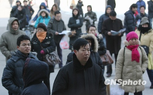 1月9日,在中国人民大学硕士生入学考试考点外,考生亲友正向里张望。当日,2010年全国硕士研究生考试开始,全国报名人数达到140万,比去年猛增13%。140万考生将竞争46.5万个名额,录取率为33%。就业形势严峻使相当多毕业生改变就业规划,加入考研大军,增加求职资本。中新社发 苏丹 摄