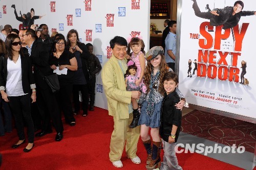 当地时间一月九日,成龙主演的好莱坞功夫喜剧片《邻家特工》(The Spy Next Door)在洛杉矶举行全球首映式。成龙与小演员一起走过红地毯。该片是成龙最新一部担纲主角的好莱坞影片。《邻家特工》将于本月十五日在美国、中国等地同步上映。中新社发 张炜 摄