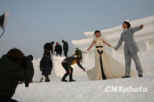 1月9日,在沈阳棋盘山冰雪大世界,一对情侣在一座大型雪雕前拍摄婚纱照。沈阳国际冰雪节即将开幕,不少即将结婚的情侣抓住时机,选择难得的各种雪雕冰雕雪景拍摄结婚照,感到既有个性又很浪漫。 中新社发 黄金昆 摄