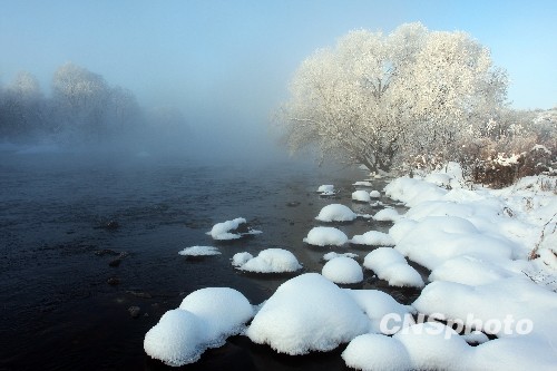 1月9日,“三九”首日,黑龙江省逊克县大平台村在出现了引人入胜的雾凇美景。黑龙江省逊克县大平台雾凇风景区山峦叠嶂,每逢冬季,库尔滨河水流经库尔滨水电站后,水温就会升高变暖, 河水载着巨大的热能源源不断的向下游倾泻,水蒸汽缭绕在沿河两岸的苍松、杨柳枝头上,凝结成晶莹剔透的雾凇,形成国内外罕见的持续时间长、涉及面积广的雾凇奇观。 中新社发 吕涛 摄