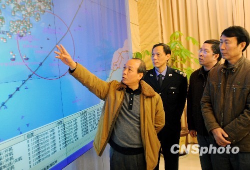 1月10日,福建省海洋与渔业厅副厅长黄世峰(左一)在该厅应急指挥中心通过福建省海上渔业安全应急指挥系统组织渔政船和大马力渔船投入“闽狮渔三七八五”失踪人员的海上搜救。目前,福建正全力组织开展搜救。九日十二时三十五分,天津籍货船“大新华营口”轮在福建莆田南日岛附近海域与福建泉州籍“闽狮渔三七八五号”渔船发生碰撞事故,造成渔船沉没,十四名船员落水,现已救起三人(其中一人死亡),其余十一人失踪。中新社发 刘可耕 摄