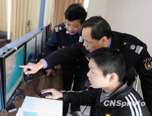 1月10日,福建省海洋与渔业厅工作人员在该厅应急指挥中心通过福建省海上渔业安全应急指挥系统,密切关注渔政船和大马力渔船投入“闽狮渔三七八五”失踪人员海上搜救的状况。九日十二时三十五分,天津籍货船“大新华营口”轮在福建莆田南日岛附近海域与福建泉州籍“闽狮渔三七八五号”渔船发生碰撞事故,造成渔船“闽狮渔三七八五”沉没,十四名船员落水,现已救起三人(其中一人死亡),其余十一人迄今仍失踪。中新社发 刘可耕 摄