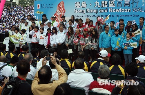 1月10日,香港公益金2010年首个大型筹款活动“港岛-九龙区百万行” 隆重举行。图为在香港大球场起步礼上,倾心参与发展本地慈善事业的文艺、传媒界众明星风光出行。中新社发 郑祚声 摄