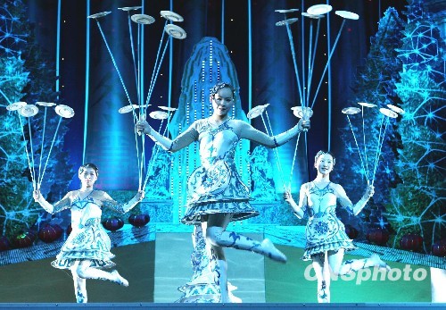 一月十日,中国浙江杭州杂技总团在莫斯科克里姆林宫旁的马涅什展览中心为俄罗斯观众演出最后一场《梦幻西湖》杂技情景剧。十天二十七场的演出让俄罗斯观众在新年长假欣赏中国杂技高难技巧的同时,也领略到清新温婉的烟雨江南气息。图为曾获法兰西共和国总统金奖的“转碟”节目。中新社发 田冰 摄