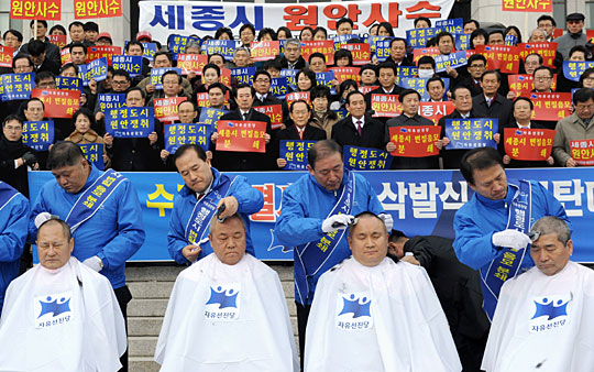 1月11日,韩国首都首尔市一批在野党议员在韩国议会大门前集体剃头,表达自己对政府修改“韩国新行政首都世宗市建设规划”的不满。