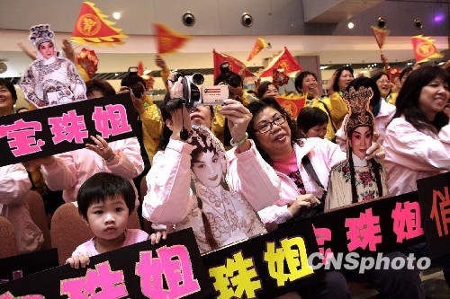 香港一批粤剧迷在在记者会场外争睹著名艺人陈宝珠风采。中新社发 张勤 摄