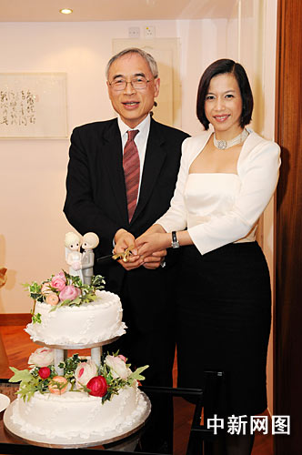 香港中文大学校长刘遵义教授与夫人、已故天王巨星张国荣的外甥女麦嘉轩女士,二零一零年一月十日于校长寓所汉园,在双方亲属见证下举行婚礼,图为两人一同切结婚蛋糕。(香港中文大学供图)