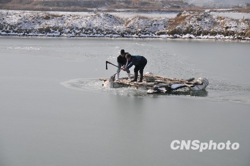 山东乳山海湾结冰,养殖户抗灾保生产。中新社发 刘国贤 摄