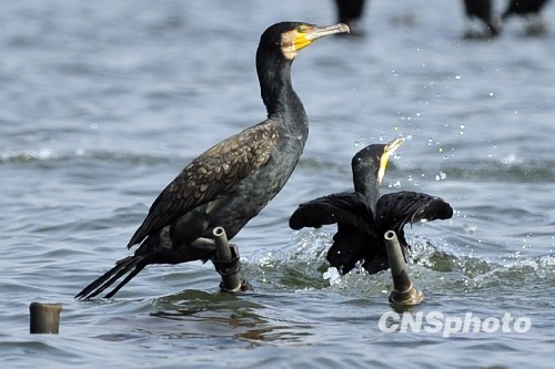2010年1月12日,雨雪过后的杭州迎来了一个难得的晴好天气,在西湖柳浪闻莺公园附近湖面露出的一排排喷泉嘴上,站满了上百只鸬鹚沐浴冬日阳光。中新社发 李忠1 摄