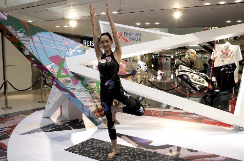 人气模特Jessica C穿着德国艺术家现场绘画的鲨鱼泳衣艺术作品,以瑜伽动作演绎艺术与运动。中新社发 张勤 摄